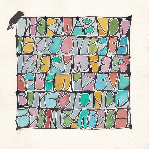 I tried continuous writing—without lifting the writing implement—using my non-dominant hand in one direction (left to right) and my dominant hand in the other direction (reverse lettering and right to left). After much practice with a Fineline applicator tip, I found the right speed to avoid putting down ink blobs—literally plowing through the quote! I used the forward and backward versions.