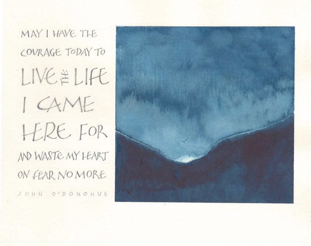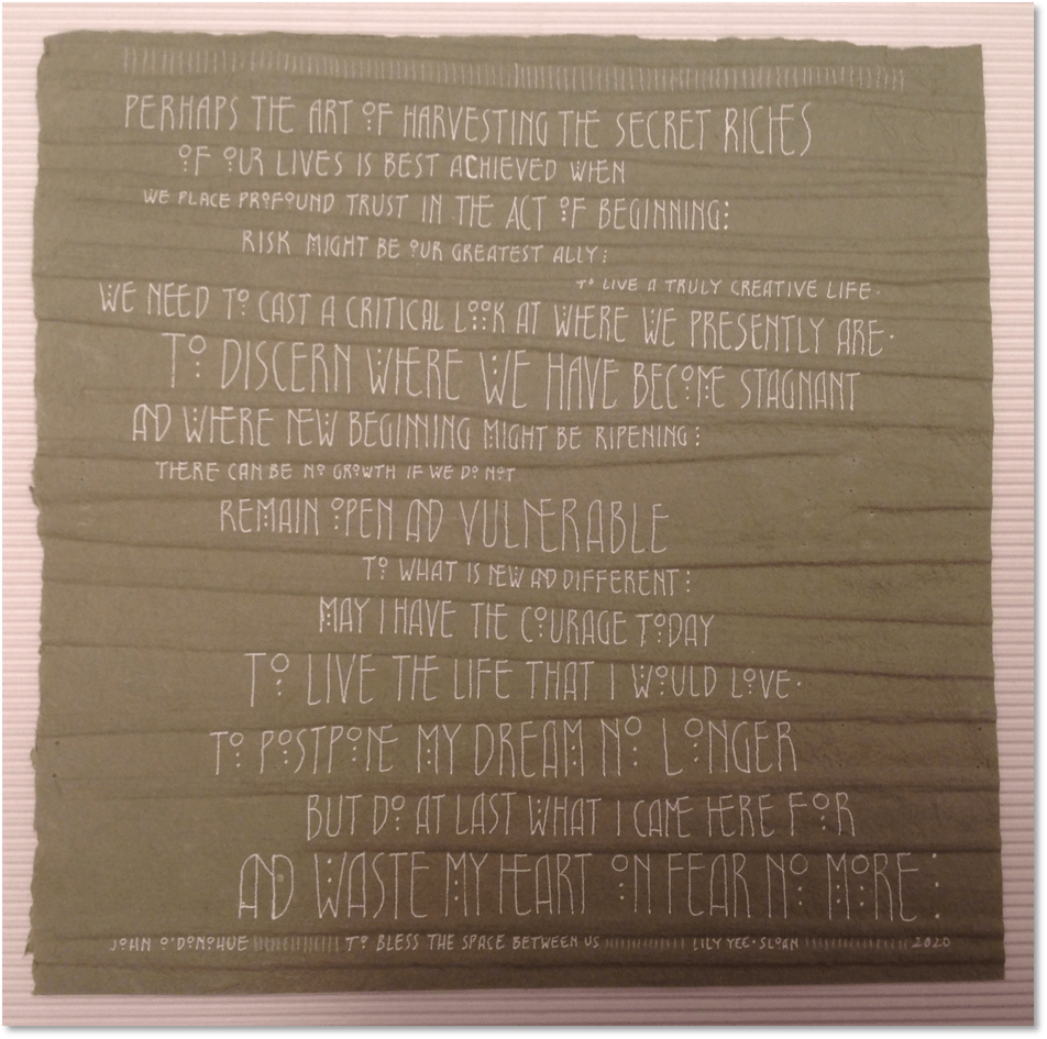 My first attempt at this John O’Donohue text was disappointing—the concept was lacking and did not inspire me to tweak it further. The colour of the original is a brighter forest green than appears here, but that was not enough to redeem it!