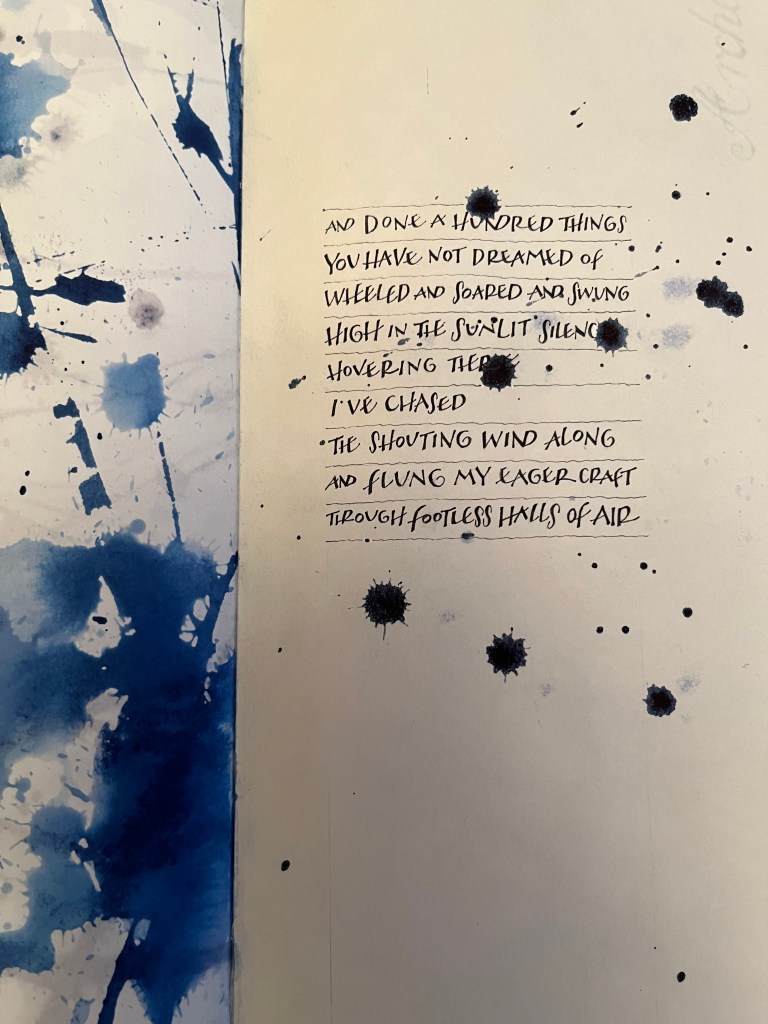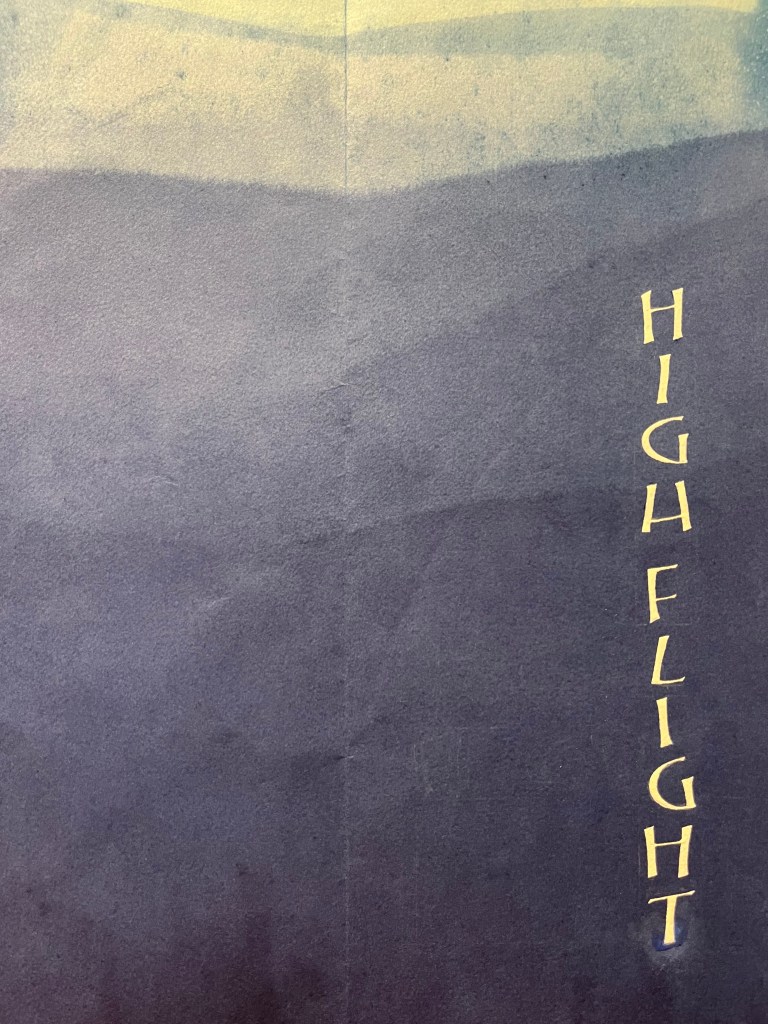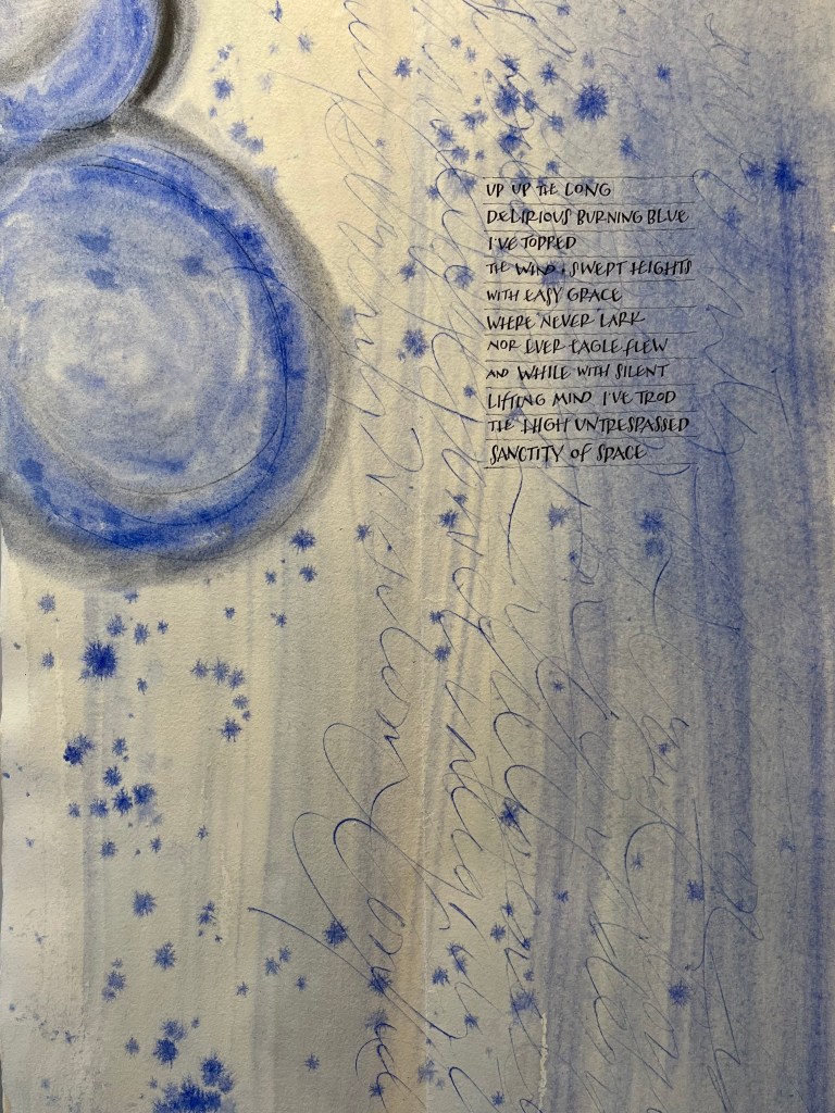 In April, I started a manuscript book class with Judy Detrick and chose a poem titled ‘High Flight’ for my final project. The painted pages embraced the poem!