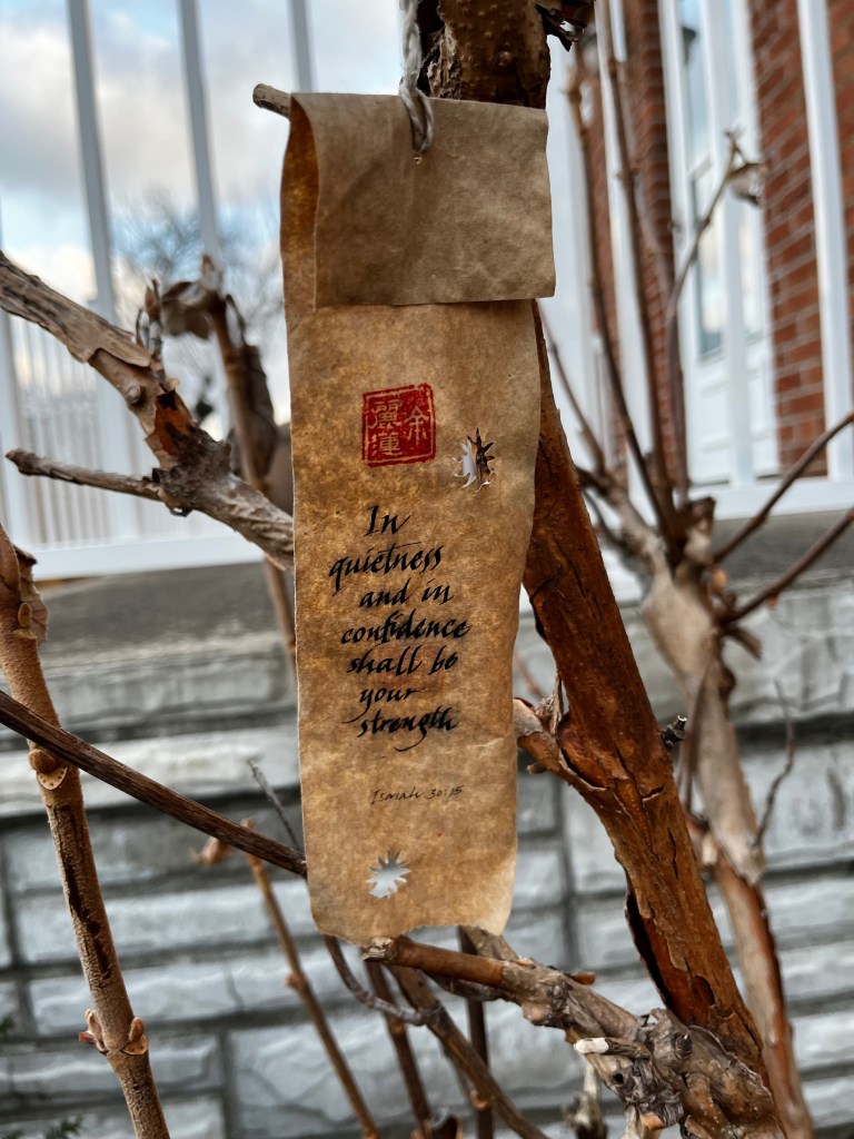 My husband and I tied the weathergrams around our property—on the back hedge, on the oak leaf hydrangea at the back porch, and on the large linden in the side yard. Today we wandered around the yard searching for the bookmark-sized messages. Only one weathergram remained, tenaciously clinging to the oak leaf hydrangea. Flapping in the fierce wind, it paused long enough for a photo. Since it was so resilient, we decided to leave it for another season as the hydrangea blooms in spring. Maybe we’ll leave it to enjoy the protective shade of summer and to be refreshed by the autumn rains. Might it be strong enough to survive until the winter solstice?